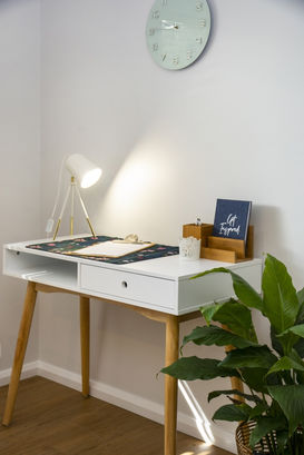 Modern kitchen with full-size fridge, coffee machine and basic cooking facilities.